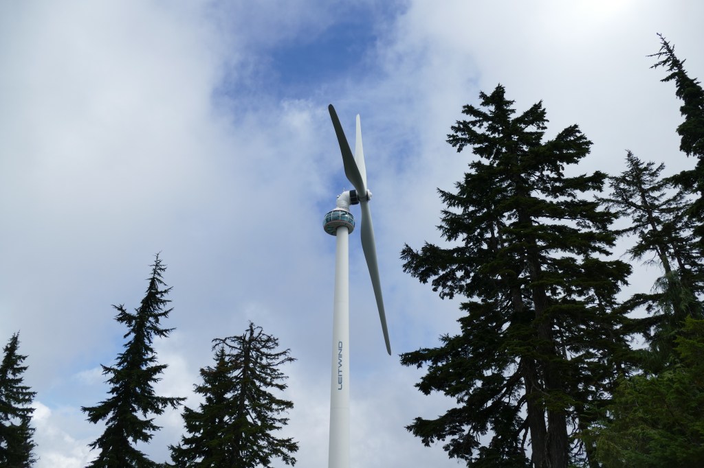 Um uns herum gibt es viele Lifte, die im Winter die Skifahrer nach oben bringen. Eine Gondel zum Gipfel ist in Betrieb. Leider ist die Sicht von hier oben sehr schlecht und das „Eye of the Wind“, ein riesiges Windrad mit Aussichtsplattform ist auch geschlossen. Schade!