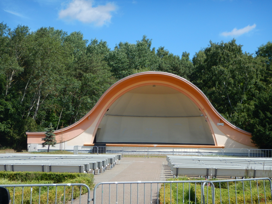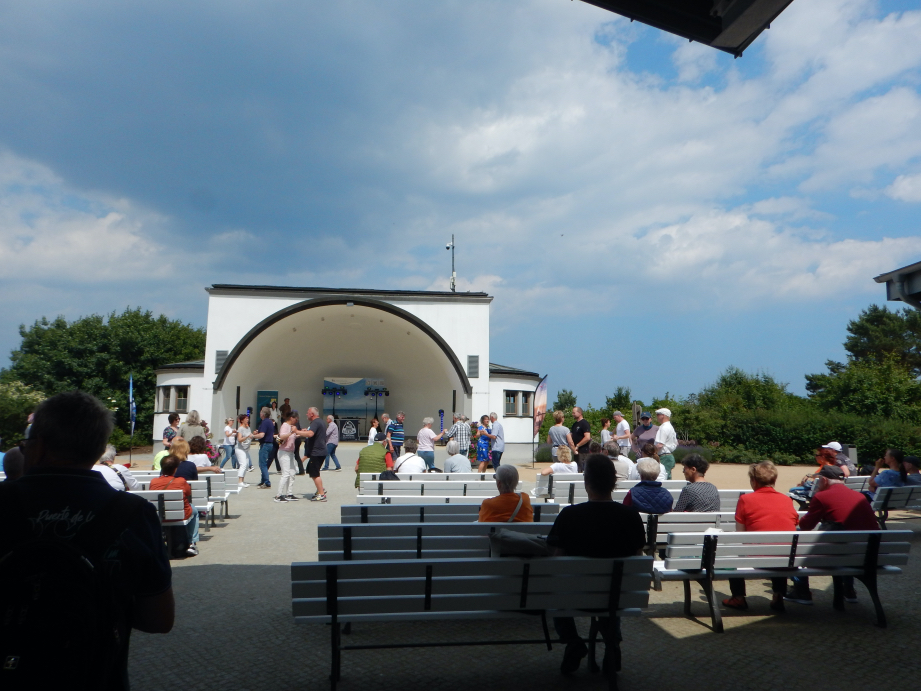 Wir parken auf der anderen Seite der Dünenstrasse Ost, wo 20 Minuten 50 Cent kosten. Von dort sind es nur ein paar Schritte bis zur Seebrücke. Davor findet man das Restaurant „Strandbistro Zur Düne“ mit Blick auf den Strand und leckeren Fish&Chips und Fischbrötchen. Es ist sehr warm, obwohl es erst Anfang Juni ist und es macht Spaß mit den Füßen im Wasser am Strand entlang zu laufen. Das finde ich generell in den Ostseebädern sehr schön, dass man endlos am Wasser entlang laufen kann, oftmals ohne Unterbrechung bis zum nächsten Seebad. Als wir über die Strandpromenade zurück gehen, kommen wir an der Konzertmuschel vorbei, wo gerade eine Art Tango-Tanzveranstaltung im Freien stattfindet. Wir schauen den Tanzpaaren ein wenig zu bevor wir weiter Richtung Heringsdorf fahren.