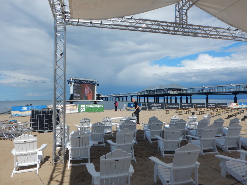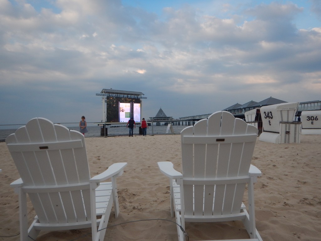 Nach diesem eindrucksvollen Vormittag wollen wir den letzten Tag ruhig ausklingen lassen und mieten noch einmal einen Strandkorb in Heringsdorf. Ganz plötzlich verdunkelt sich der Himmel und ein starker Regenguss stört unsere Idylle. Wenn wir jetzt gehen, sind wir patschnass. Wir klappen den Korb hoch und hängen meine wasserdichte Stranddecke davor. 30 Minuten sitzen wir dort und hören den Regen auf das Dach trommeln. Außer uns lässt sich nur noch eine Frau im Strandkorb hinter uns nicht vertreiben. Als es endlich aufhört, kommt genau so plötzlich die Sonne wieder heraus und wir können den Nachmittag doch noch genießen.