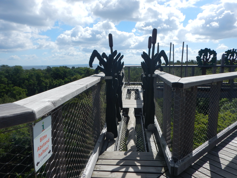 Knapp 800m läuft man in einer Höhe um die 20m auf einem Steg durch den Wald. Unterwegs findet man Erlebnis-Stationen zum Sehen, Fühlen und Balancieren oder Infotafeln, die interessante Fakten über Flora und Fauna der Insel erzählen.