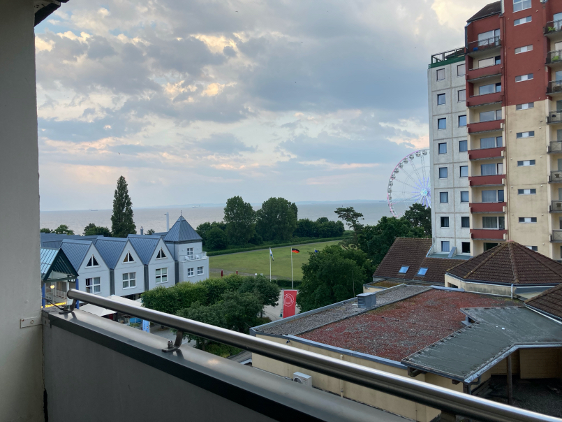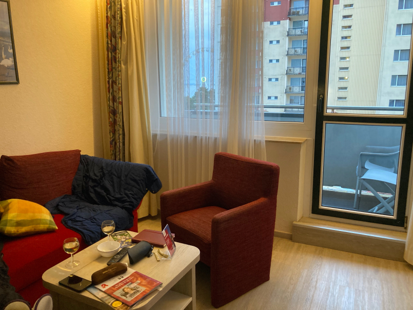 Angekommen am „Kurhotel zu Heringsdorf“ sind wir erst mal etwas geschockt. Der Riesenbau, etwas in die Jahre gekommen, passt so gar nicht zu einem netten Strandort. Im Innern ist jedoch inzwischen viel renoviert und unsere Ferienwohnung modern und komfortabel eingerichtet. Sie verfügt über ein Schlafzimmer mit ausreichend Platz für Kleidung und Koffer, eine Küchenzeile im Eingangsbereich und ein Wohnzimmer mit Polstermöbeln und Esstisch. Dazu gibt es einen kleinen Balkon, der aber nicht wirklich zum Verweilen einlädt. Er ist etwas herunter gekommen, die Balkonmöbel sind sehr einfach und man schaut im Wesentlichen auf die Wand des gegenüberliegenden Gebäudetrakts, in dem noch das Kurhaus untergebracht ist. Über die Häuser hinweg kann man allerdings die Strandpromenade sehen. Wie wir später merken, gibt es auf dem Balkon noch ein anderes Problem. Als ich mit einem Glas Wein und Chips an dem kleinen Tisch sitze, kommt wie aus dem Nichts eine riesige Möwe angeflogen, die die Chipstüte stiehlt und nur schwer davon abzubringen ist, mir ins Wohnzimmer zu folgen. Dabei ist sie nicht zimperlich und hackt auf meinen Fuß ein. Also: auf keinen Fall etwas Essbares auf den Balkon legen…